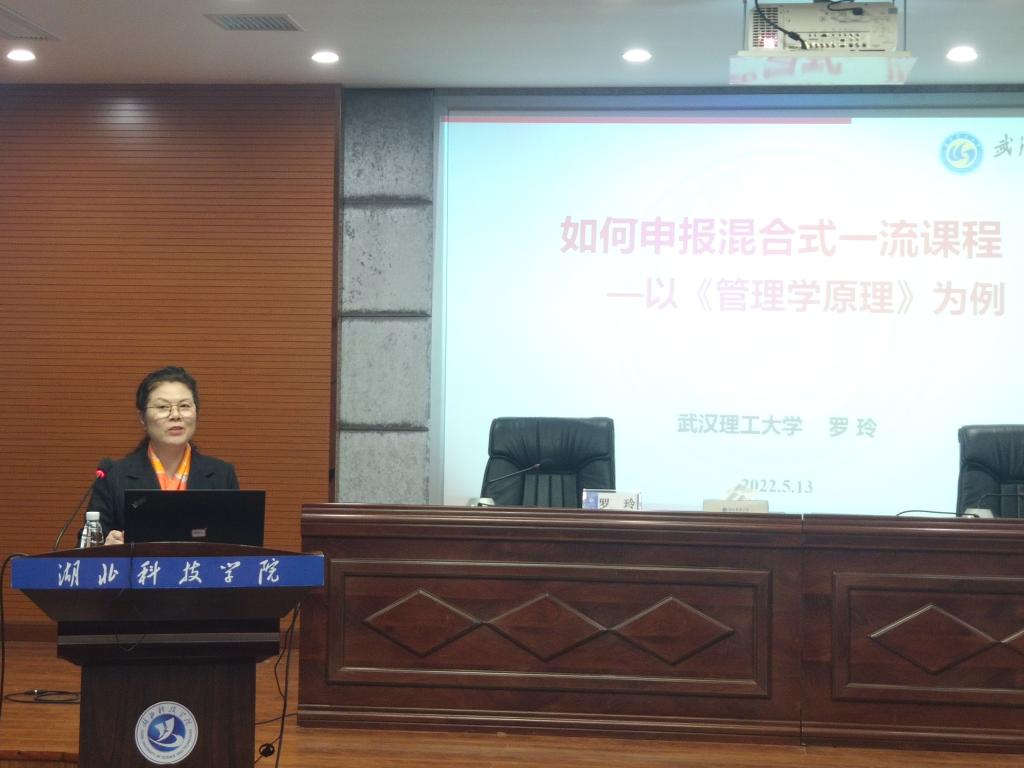 5月13日下午,武汉理工大学罗玲教授应邀为我校拟申报省级一流课程的教师们讲授了“如何申报混合式一流课程”的专题培训课。教务处鲍翠玉处长主持培训活动,各一流课程申报项目负责人及骨干教师代表参加了培训。