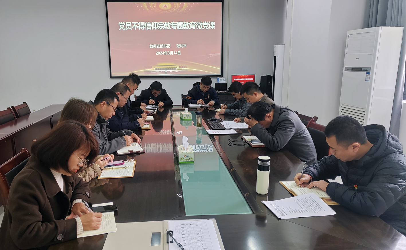 2024年3月14日,教务党支部组织开展党员不得信仰宗教专题教育,支部书记张利平同志以“中国共产党党员是信仰马克思主义的唯物主义者,因此不可以信仰宗教”为主题,为党支部全体人员讲授了一堂生动的微党课。